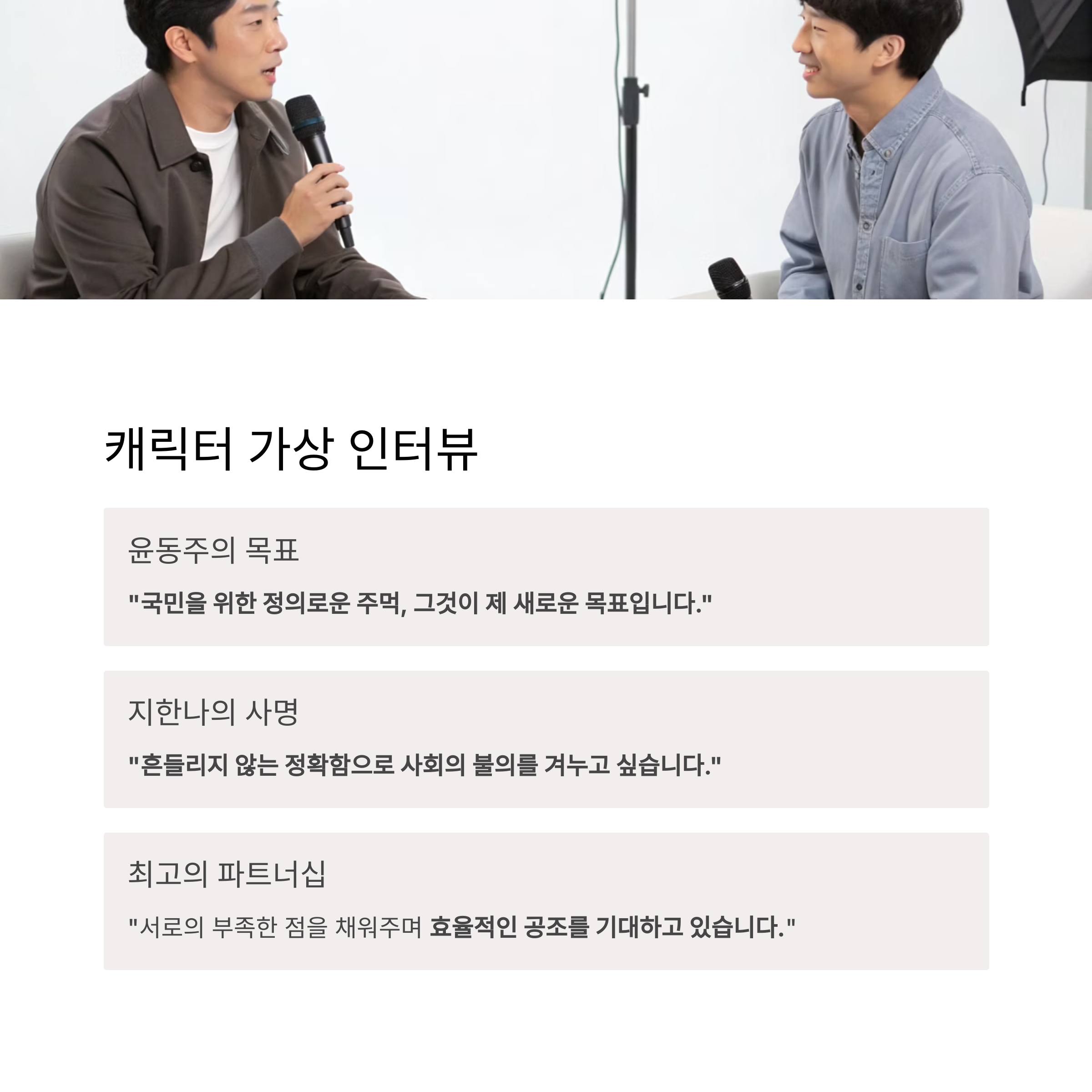 A: (윤동주) "링 위에서의 승리도 짜릿했지만, 제 주먹이 다른 사람을 지키는 데 쓰일 때 더 큰 보람을 느낄 수 있다고 생각했습니다. 국민을 위한 정의로운 주먹, 그것이 제 새로운 목표입니다."