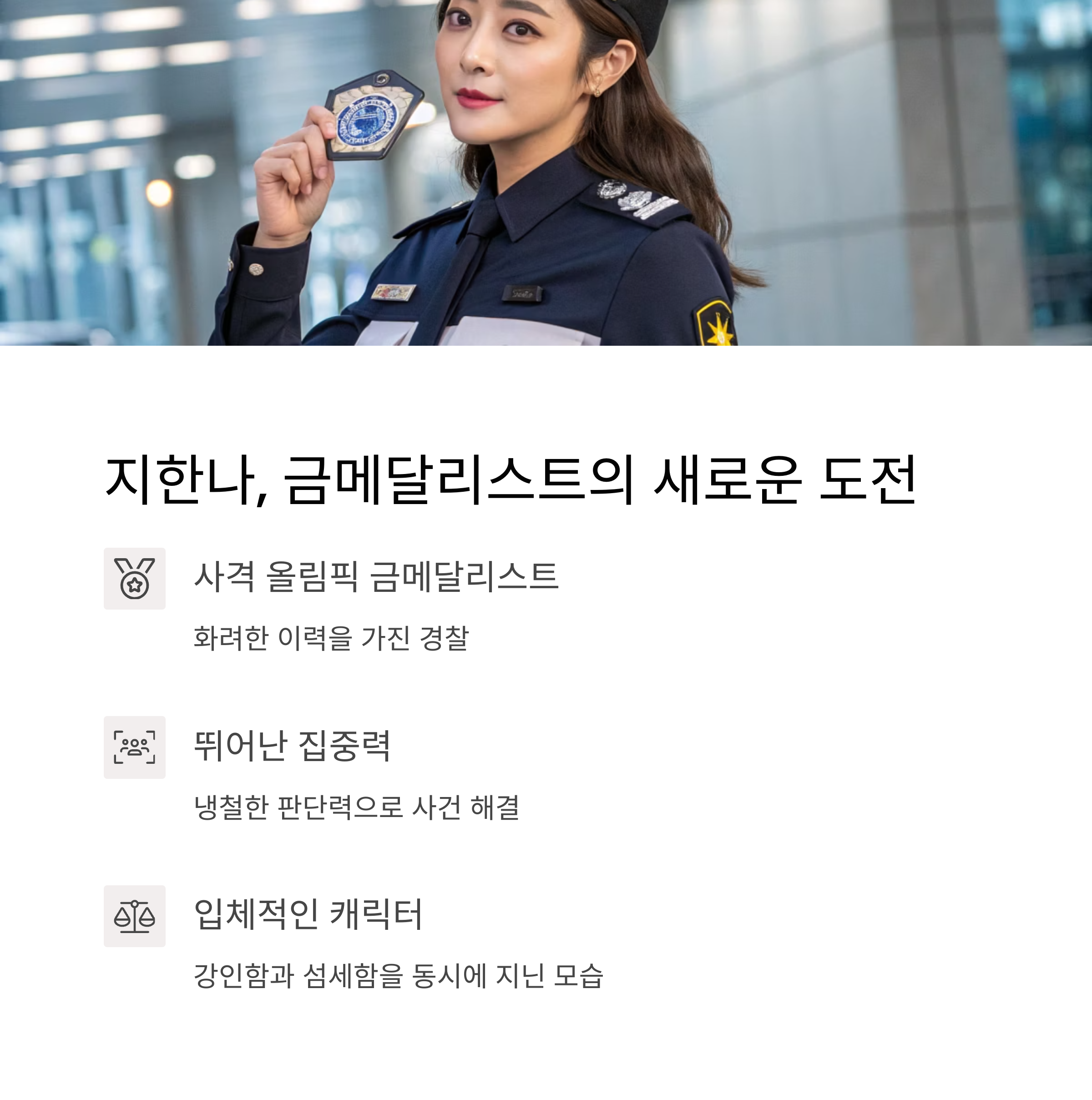 A: (지한나) "과녁을 맞히는 것보다 더 중요한 목표가 생겼기 때문입니다. 흔들리지 않는 정확함으로 사회의 불의를 겨누고 싶습니다. 그것이 제가 경찰 제복을 입은 이유입니다."