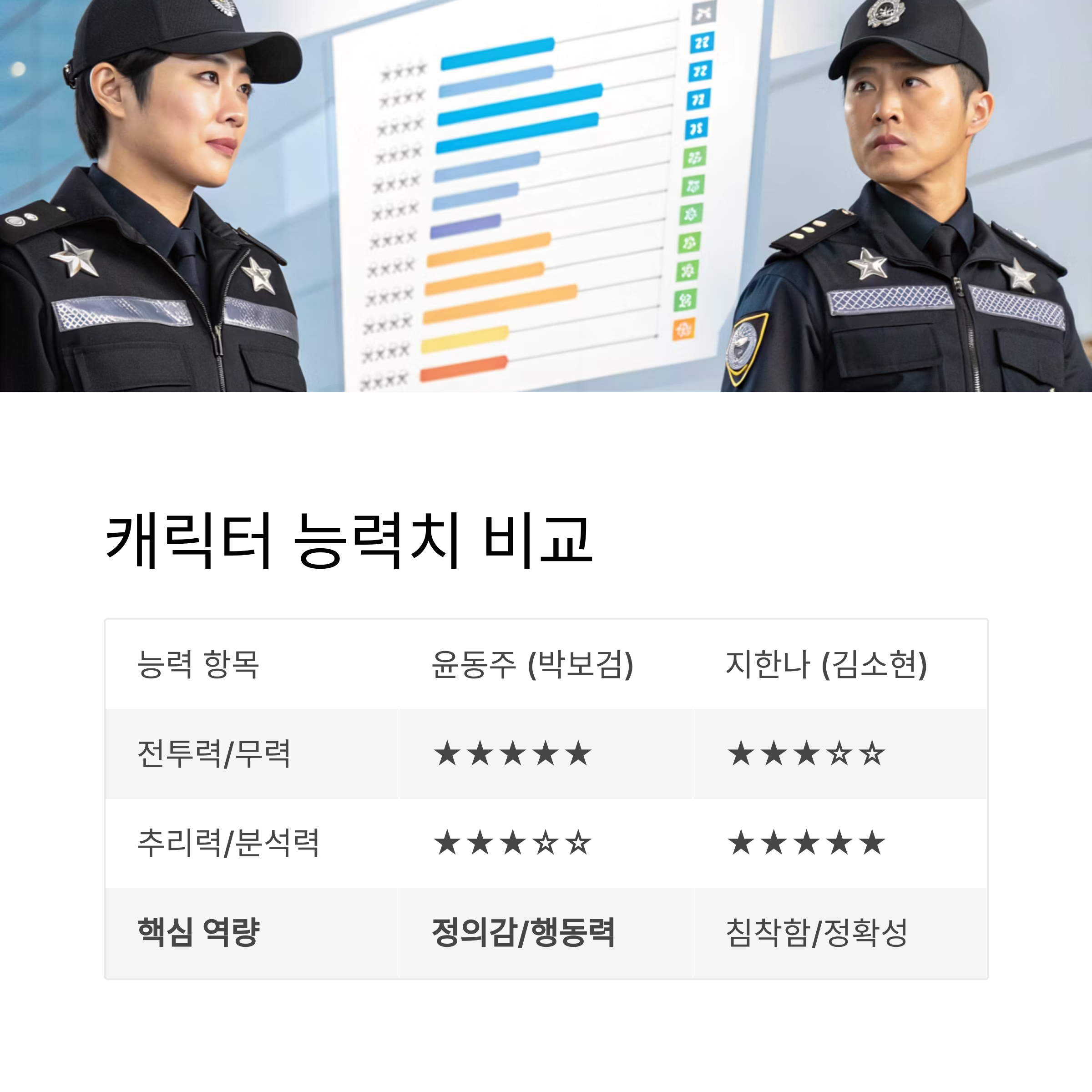| 핵심 역량 | 정의감/행동력 | 침착함/정확성 | 두 캐릭터의 상호 보완적 관계 중요 |
