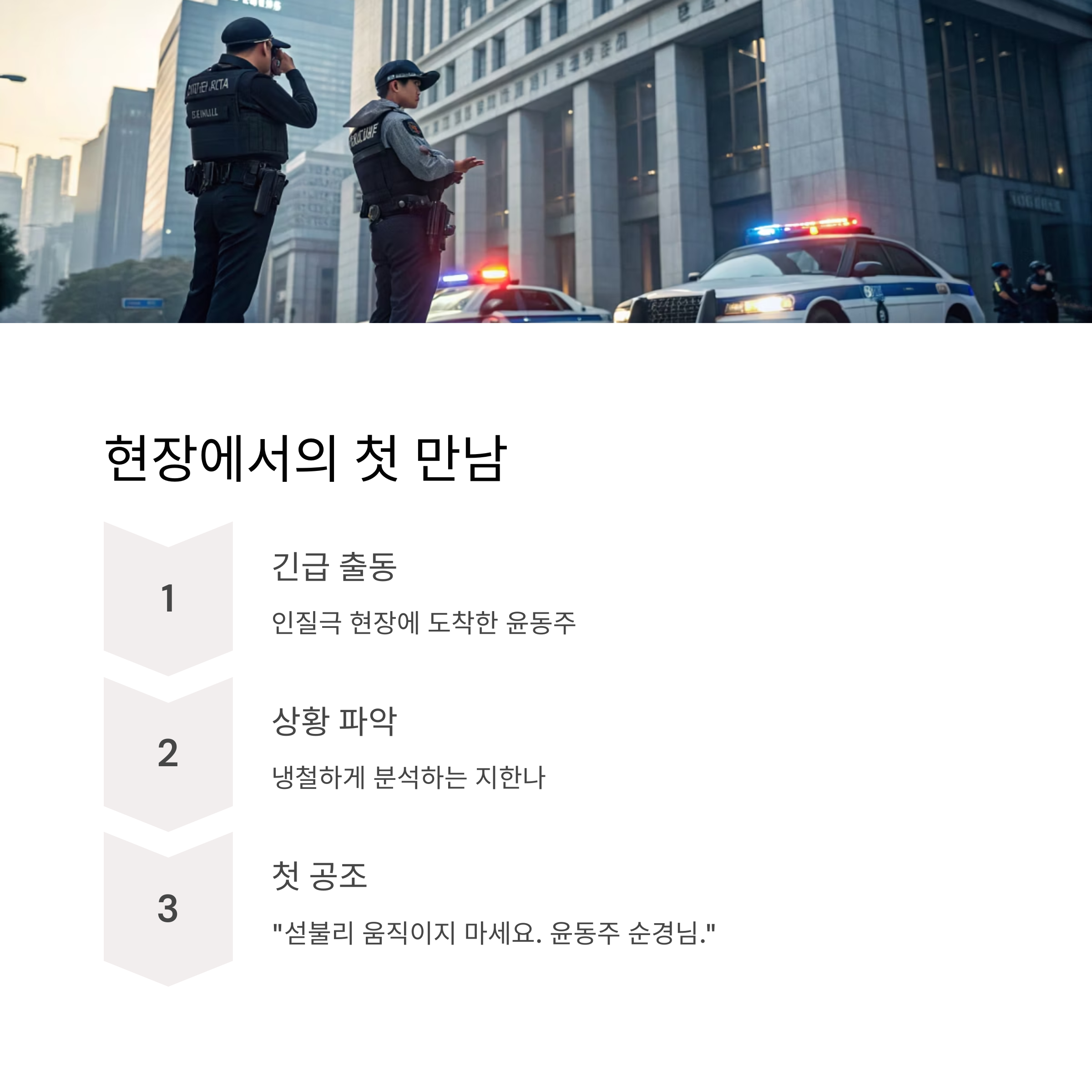 "섣불리 움직이지 마세요. 윤동주 순경님." 지한나의 차분한 목소리가 그의 흥분을 가라앉힙니다.