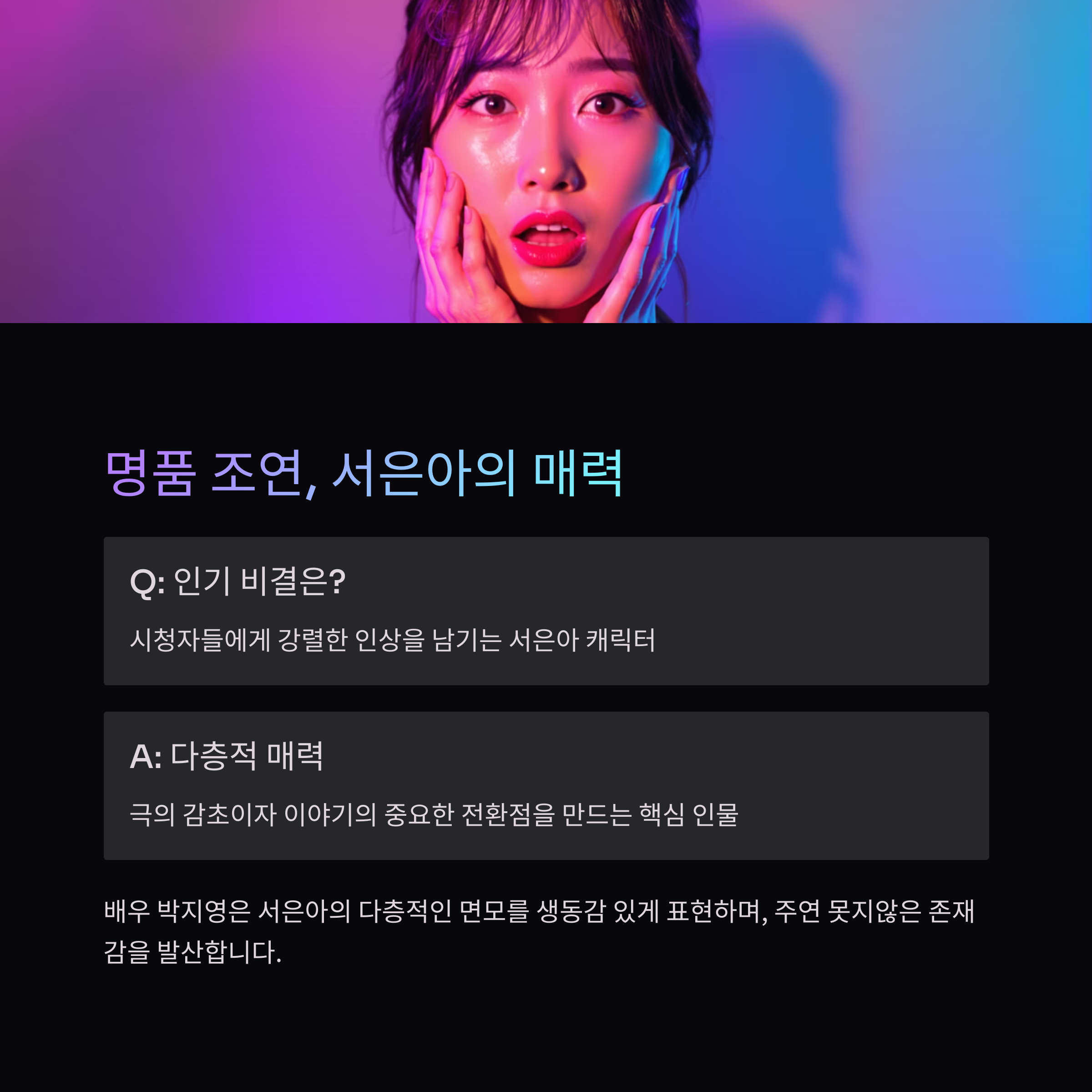 배우 박지영은 서은아의 다층적인 면모를 생동감 있게 표현하며, 주연 못지않은 존재감을 발산하고 있습니다.