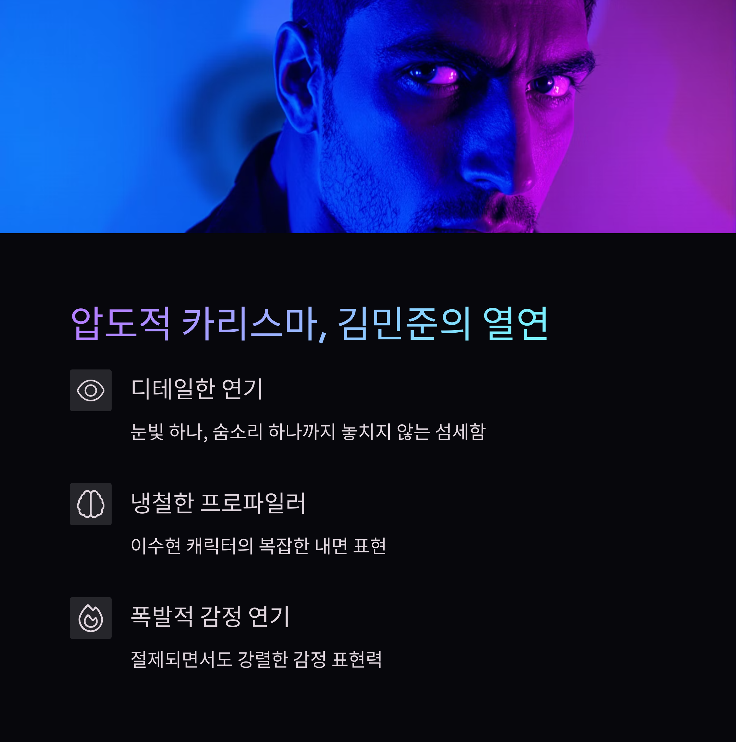 김민준 배우의 절제되면서도 폭발적인 감정 연기는 이수현이라는 캐릭터를 더욱 입체적이고 매력적으로 만들었습니다.