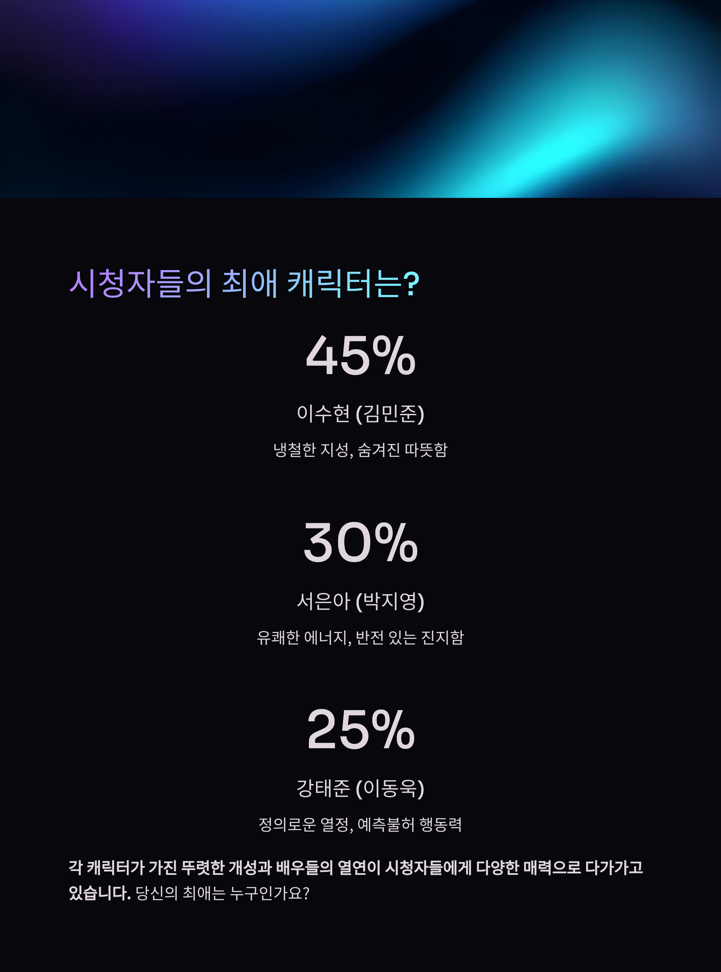 | 이수현 (김민준 분) | 45% | 냉철한 지성, 숨겨진 따뜻함 |