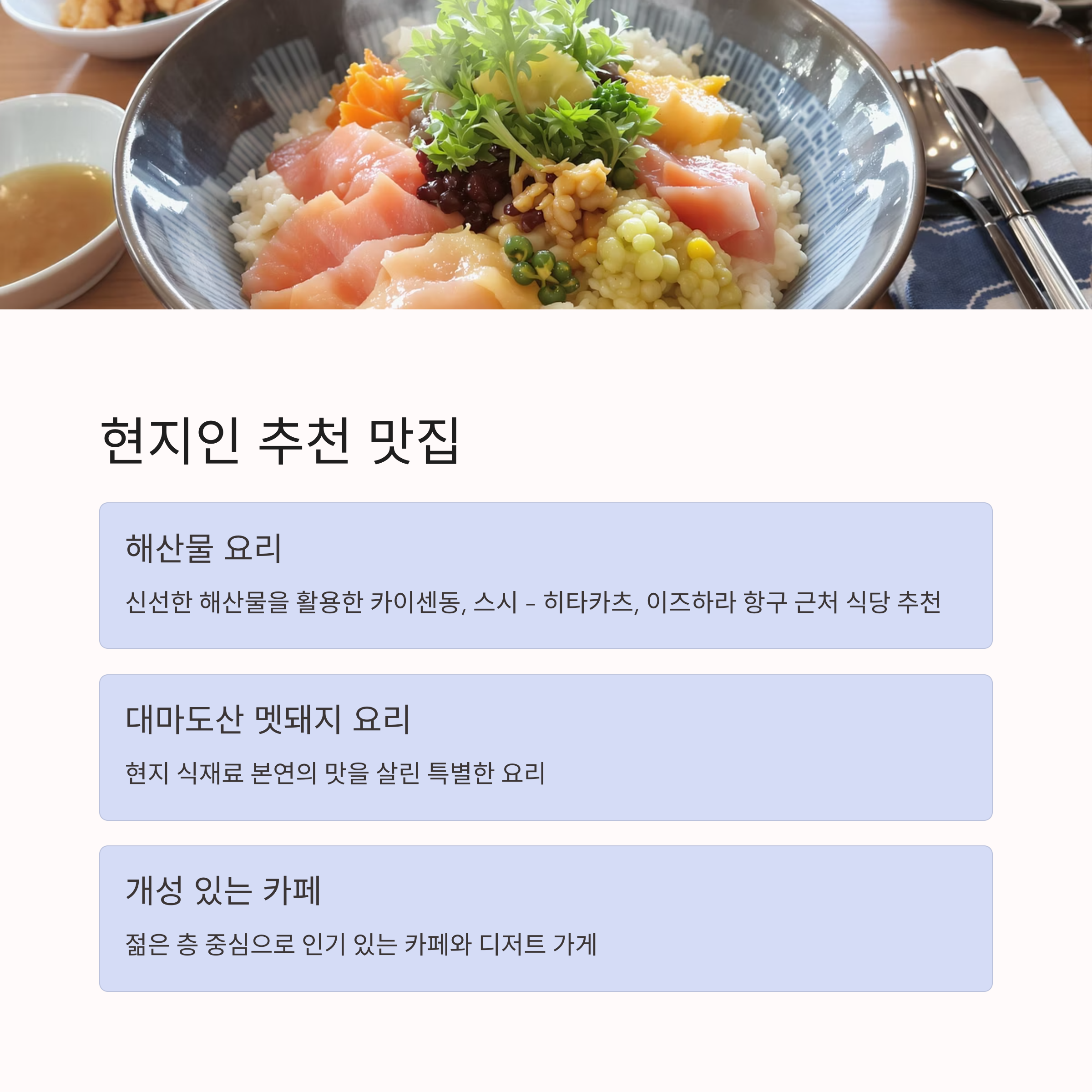 실제로 신선한 해산물을 활용한 카이센동이나 스시, 대마도산 멧돼지 고기 요리 등은 꼭 맛봐야 할 메뉴입니다.