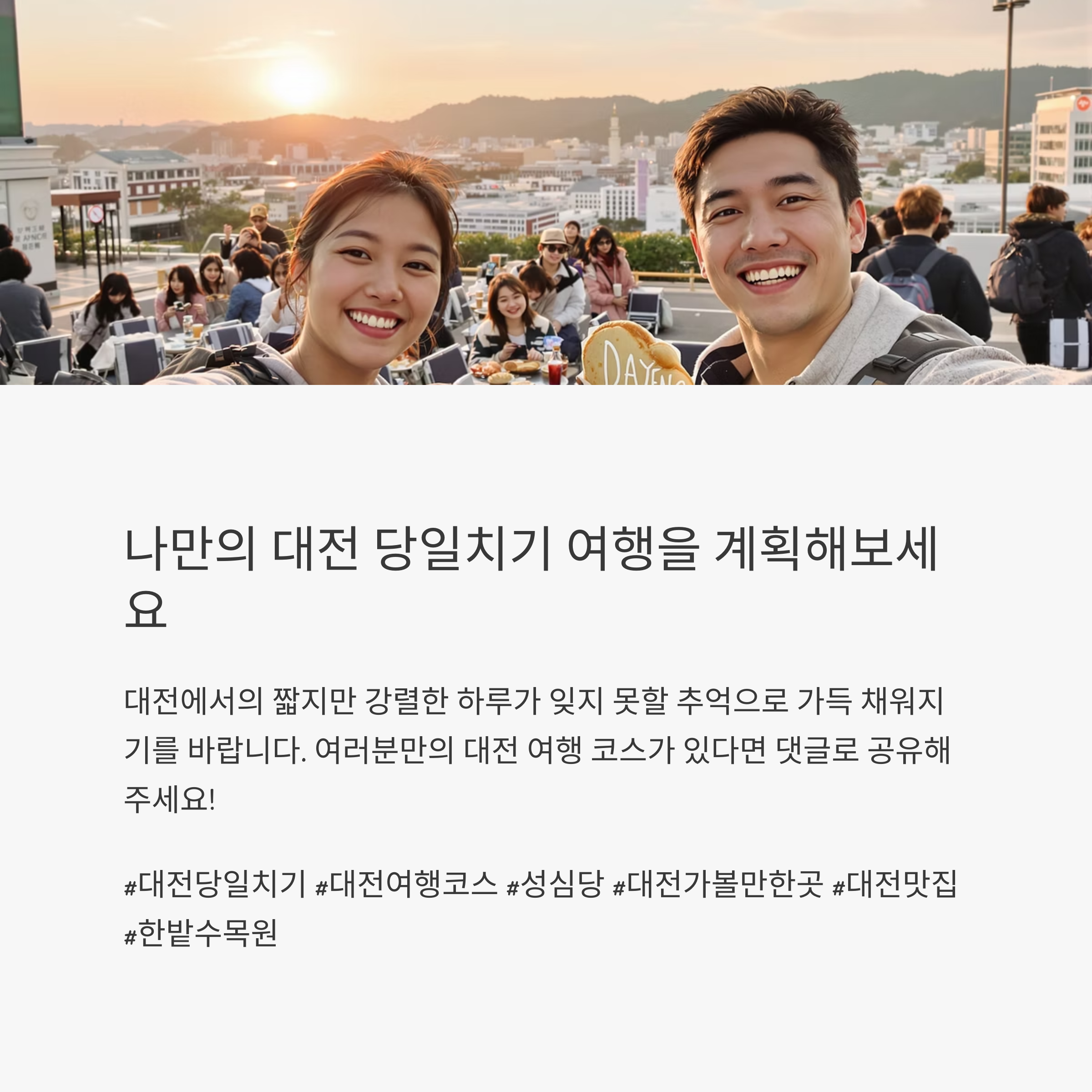 대전에서의 짧지만 강렬한 하루가 잊지 못할 추억으로 가득 채워지기를 바랍니다.