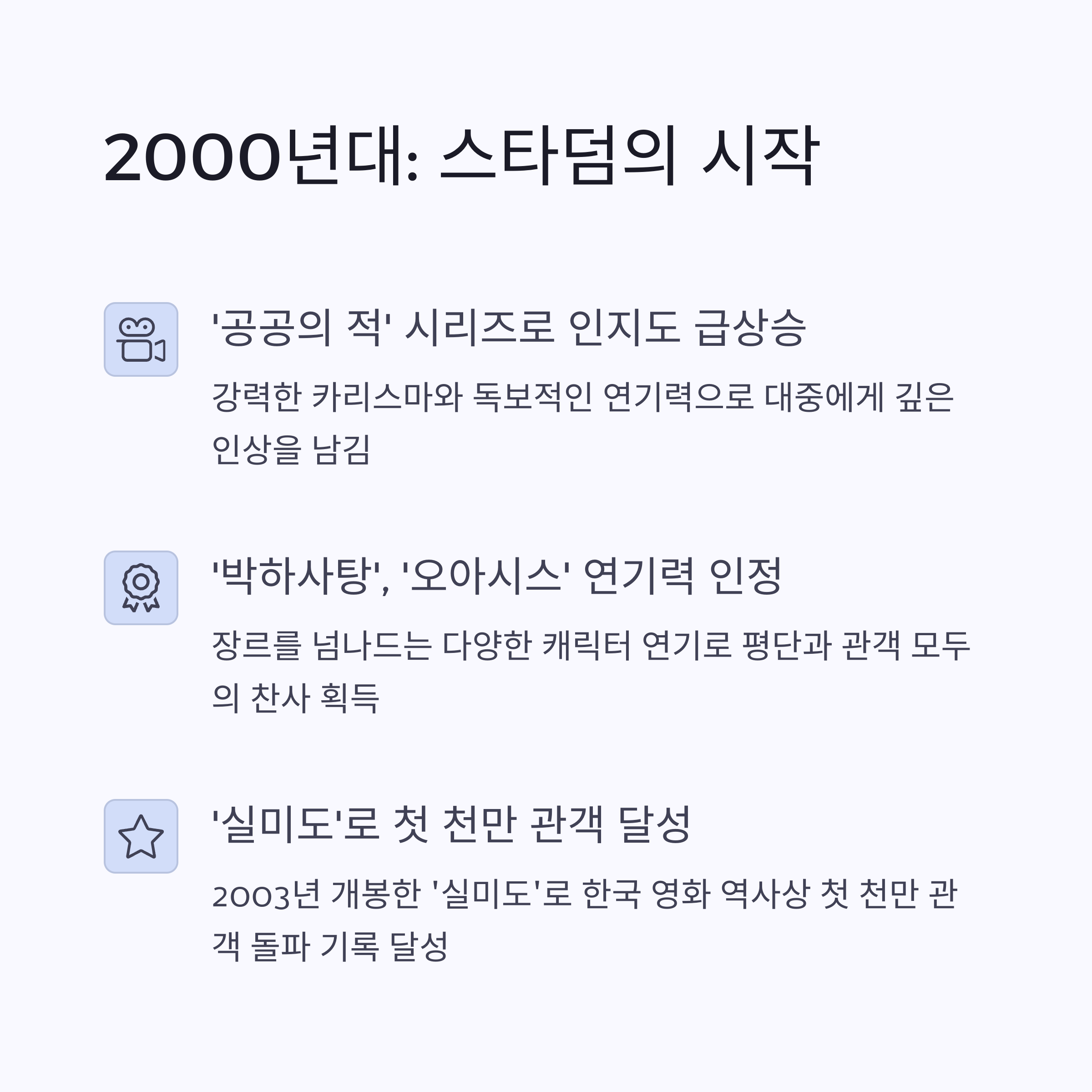 설경구는 1996년 영화 '꽃잎'을 통해 스크린에 데뷔했습니다. 이후 다양한 역할을 맡으며 탄탄한 연기력을 쌓아왔으며, 특히 2000년대 초반 '공공의 적' 시리즈를 통해 강렬한 카리스마를 선보이며 대중의 인정을 받았습니다. '공공의 적'에서 강철중 형사 역할을 맡아 현실적이면서도 강렬한 연기로 관객들에게 깊은 인상을 남겼으며, 이는 그의 대표적인 캐릭터 중 하나로 자리 잡았습니다.