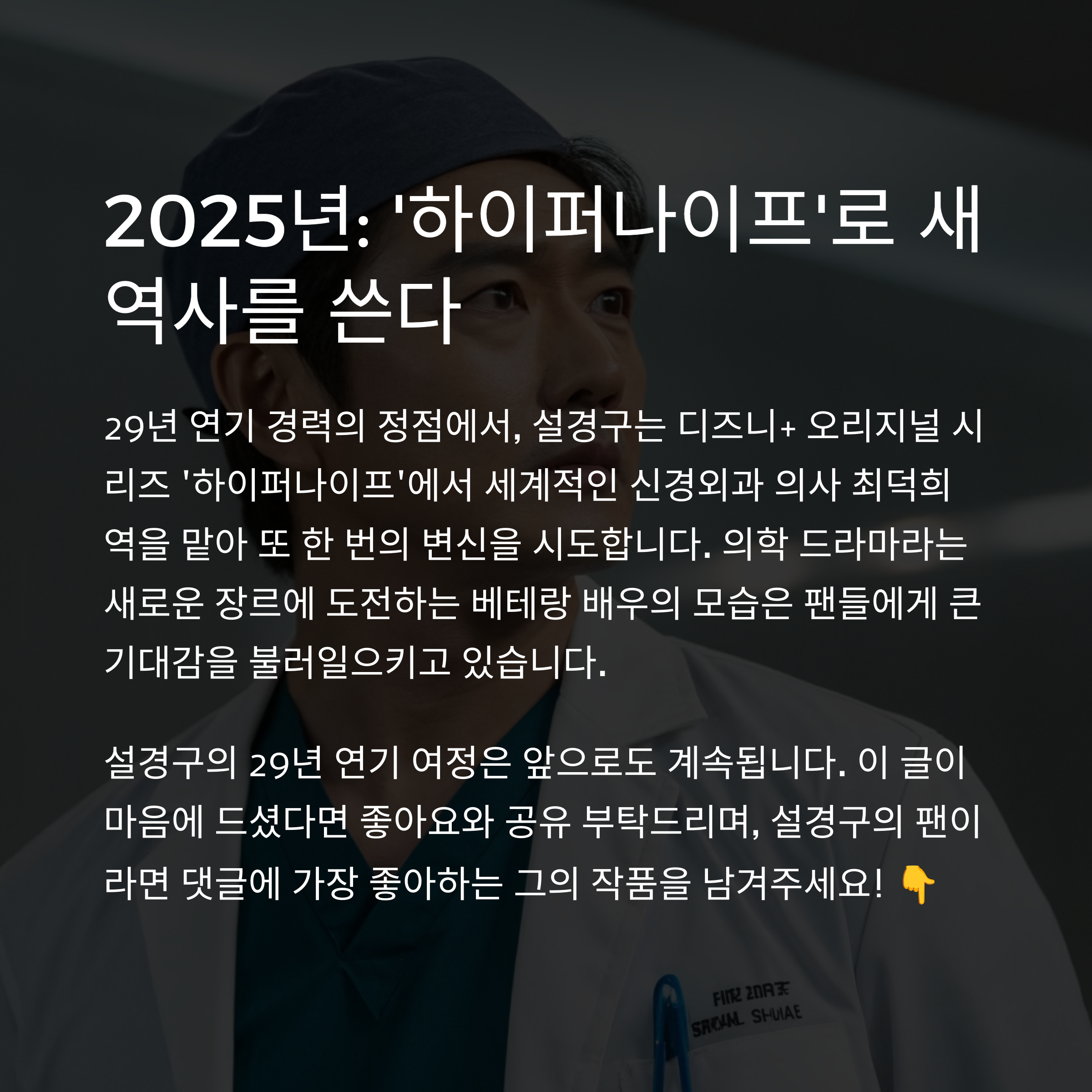 설경구는 지난 29년간 꾸준한 연기 활동을 이어오며 다양한 캐릭터를 완벽하게 소화해 왔습니다. 그의 작품들은 대중에게 감동과 재미를 선사했으며, 앞으로도 더욱 폭넓은 연기 스펙트럼을 보여줄 것입니다. 2025년 공개될 '하이퍼나이프'를 통해 우리는 또 한 번 새로운 모습의 설경구를 만나게 될 것입니다. 그의 연기 여정은 여전히 현재 진행형입니다.