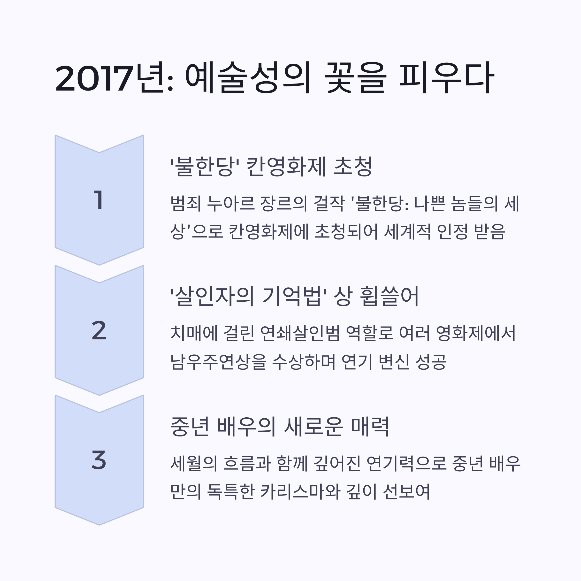2010년대에는 감성적인 연기가 돋보이는 작품에 출연하며 배우로서 또 다른 전성기를 맞이했습니다. 특히 영화 '소원'에서 보여준 아버지 역할은 깊은 감정 연기로 많은 관객들에게 감동을 선사했습니다. 또한 '불한당: 나쁜 놈들의 세상'에서 스타일리시한 범죄자의 모습을 완벽히 소화하며 새로운 연기 스펙트럼을 보여주기도 했습니다.