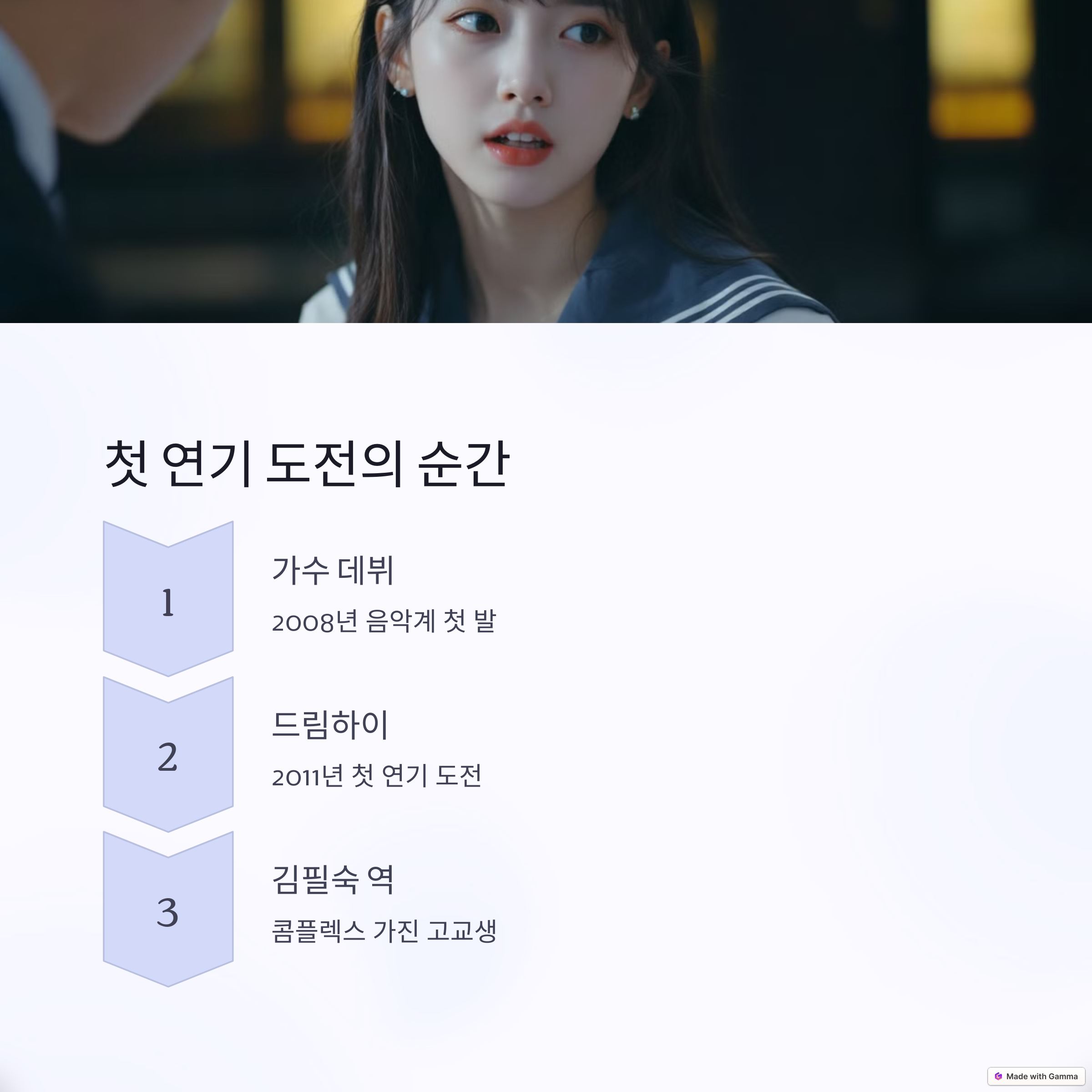 아이유는 2008년 가수로 데뷔한 이후, 2011년 KBS 드라마 ‘드림하이’에서 연기자로서 첫 발을 내디뎠습니다. 이 작품에서 그녀는 외모 콤플렉스를 가진 고등학생 김필숙 역을 맡아 풋풋한 연기를 선보였으며, 가수로서의 이미지와는 다른 새로운 모습을 보여주었습니다. 이후 ‘최고다 이순신’, ‘예쁜 남자’ 등 다양한 드라마에 출연하며 연기 경험을 쌓아 나갔지만, 초반에는 다소 어색한 발음과 감정 표현이 부족하다는 평가를 받기도 했습니다.