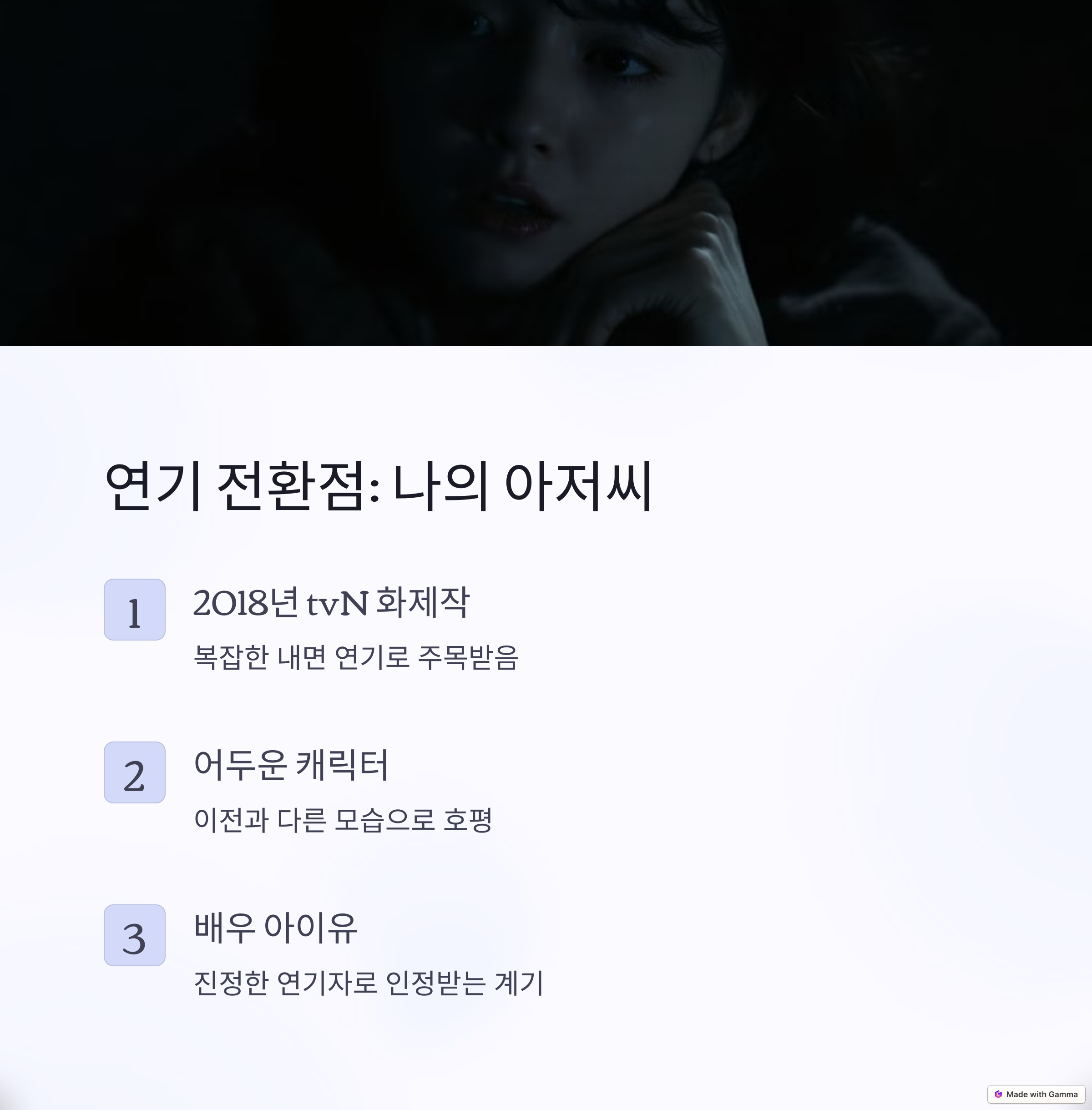 아이유의 연기 인생에서 가장 큰 전환점은 2018년 tvN 드라마 ‘나의 아저씨’였습니다. 이 작품에서 그녀는 차갑고 무기력한 캐릭터 이지안을 연기하며 이전보다 훨씬 깊이 있는 감정을 표현해냈습니다. 극 중에서 그녀가 보여준 섬세한 감정 연기와 현실적인 대사 전달은 많은 시청자들에게 깊은 인상을 남겼으며, 이를 통해 연기자로서의 입지를 확고히 다지는 계기가 되었습니다.
