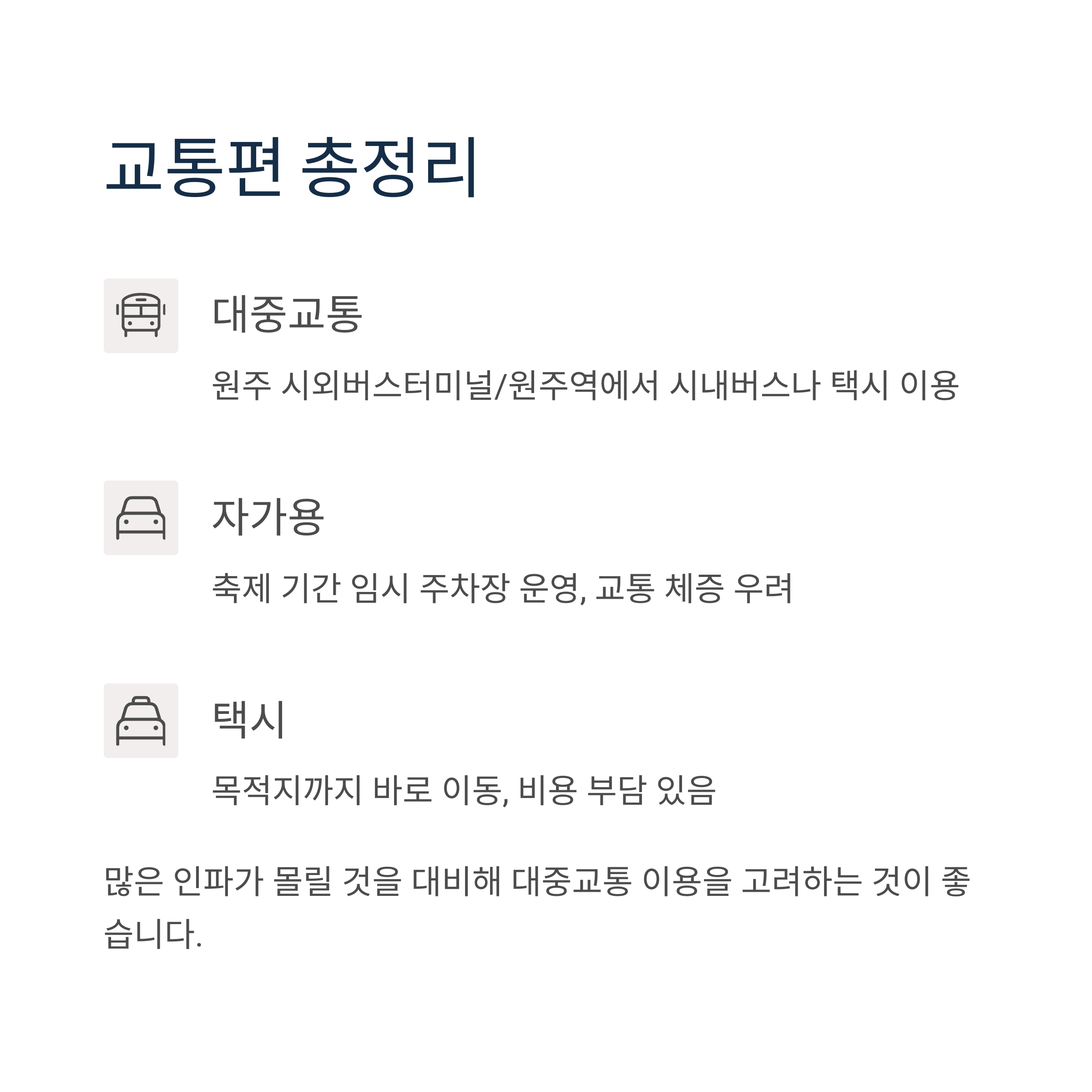 대중교통 이용 시, 원주 시외버스터미널이나 원주역에서 하차 후 시내버스나 택시를 이용하면 편리하게 축제장 인근에 도착할 수 있습니다.