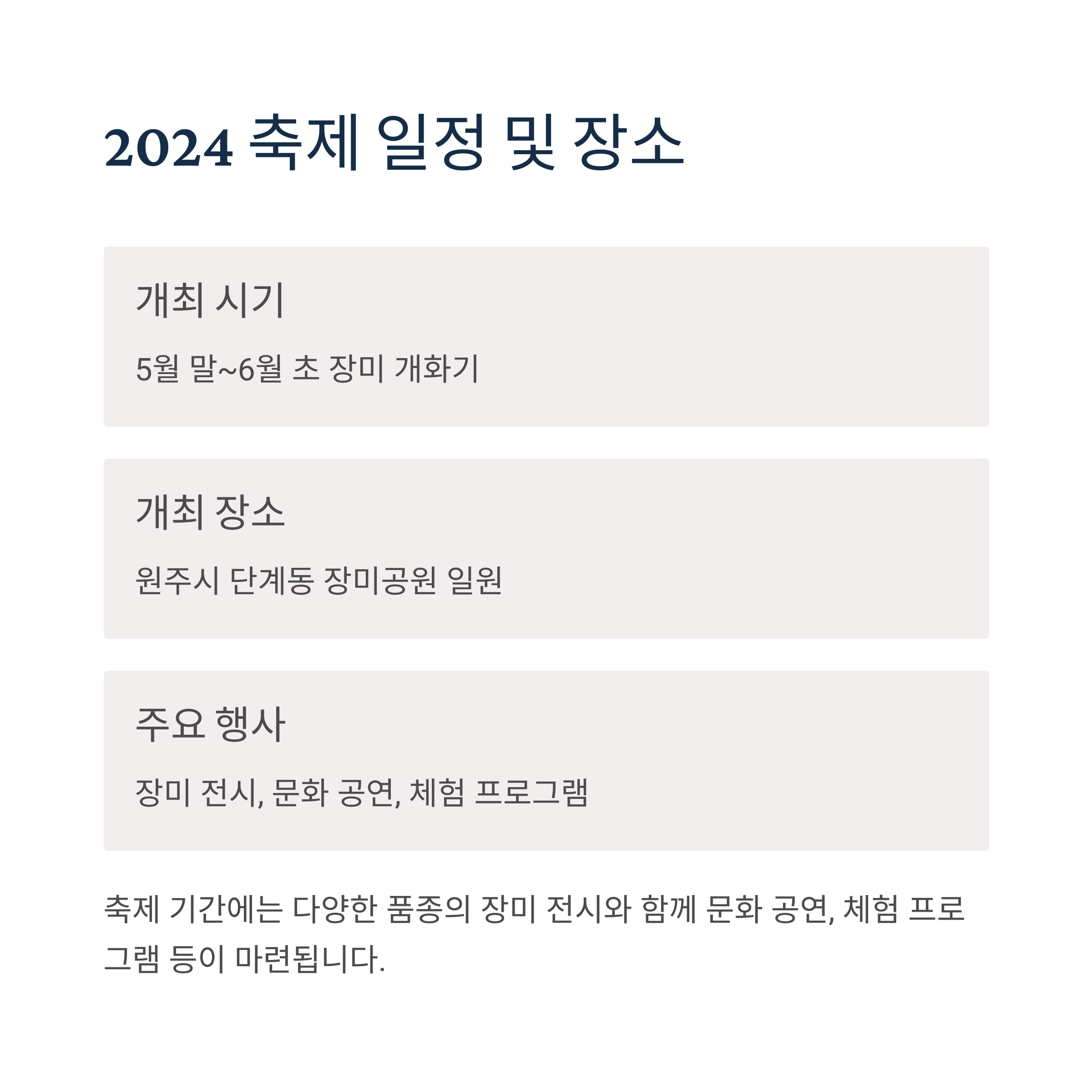 주로 원주시 단계동 장미공원 일원에서 다채로운 행사와 함께 진행되며, 수만 송이의 장미가 만들어내는 황홀한 풍경은 방문객들에게 잊지 못할 추억을 선사합니다.