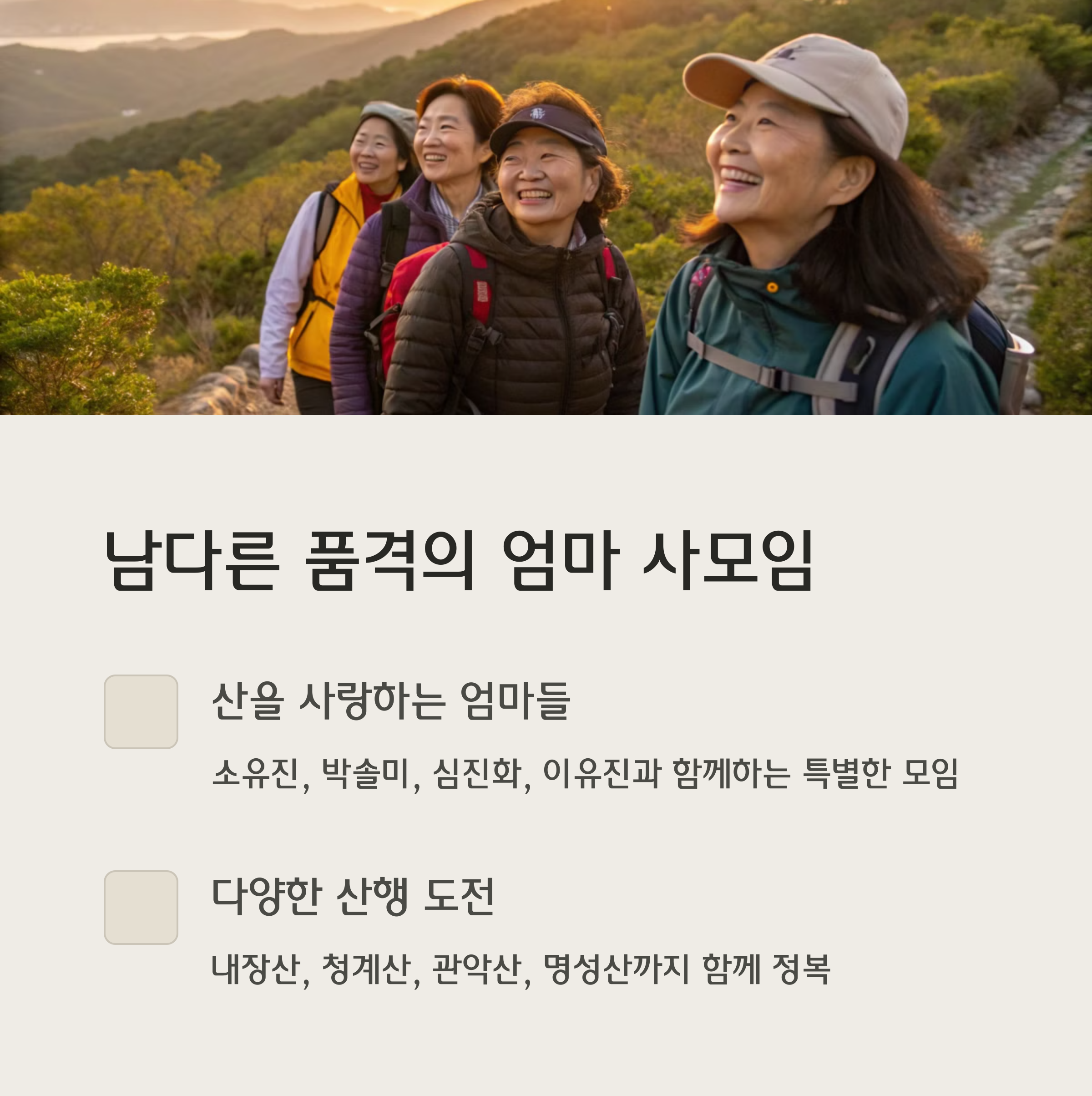 | 소유진, 박솔미, 심진화, 이유진 | 등산, 홈파티, 새벽 등산 | 내장산, 청계산, 관악산, 명성산 |