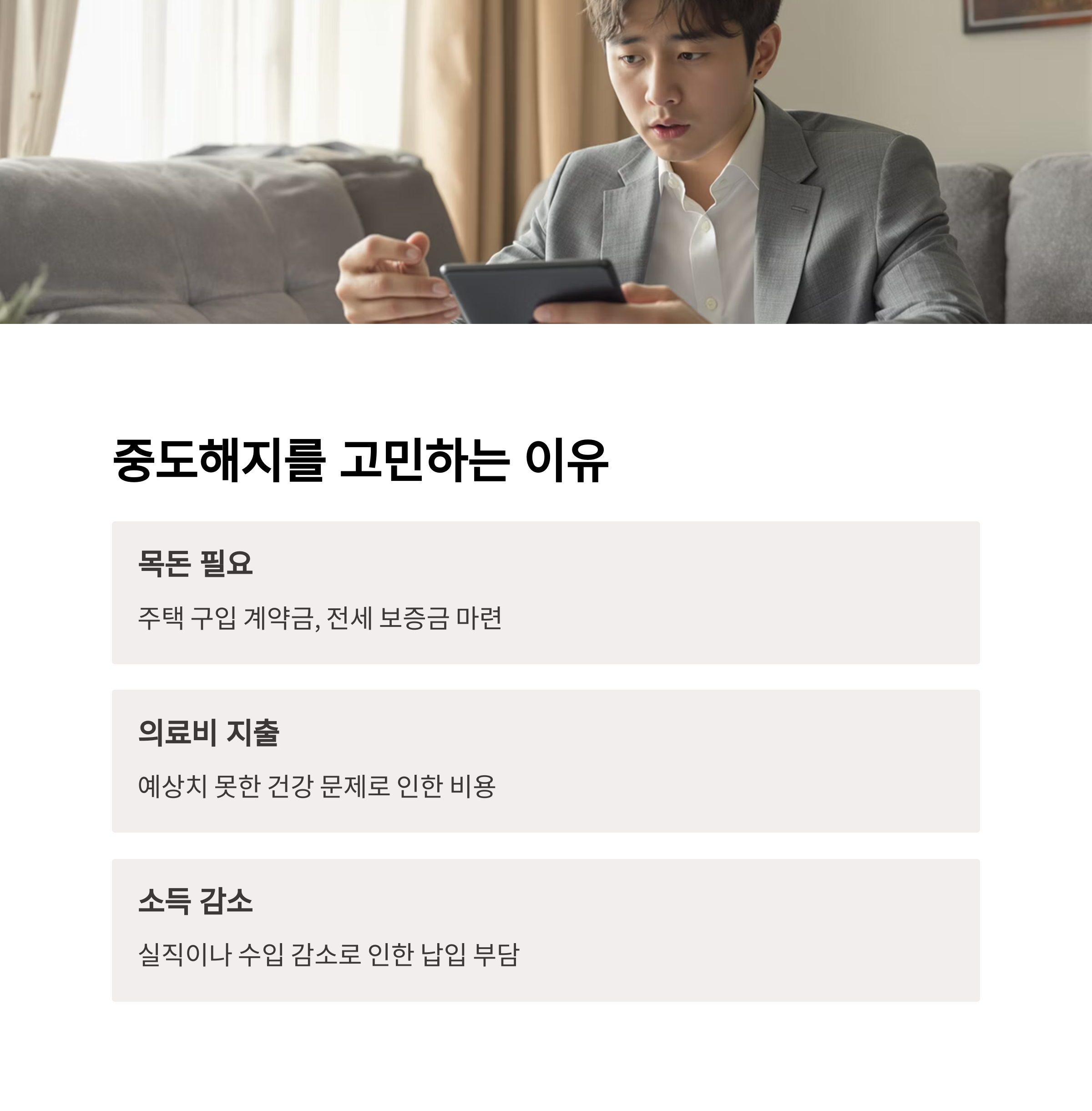 따라서 중도해지는 정말 다른 대안이 없는 불가피한 상황에서만 고려해야 할 최후의 선택지입니다."라고 강조합니다.